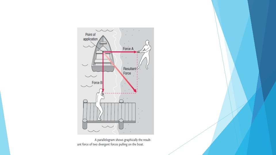 q To produce concurrent forces, two or more forces must act from a common point but pull in different (divergent) directions, such as the two people pulling on the boat. q The net effect of these two divergent forces is called the resultant force. Because forces are vectors, they can be shown graphically using what is called the parallelogram method. First draw in vectors for the two forces (solid lines). Secondly, complete the parallelogram using dotted lines. Lastly, draw in the diagonal of the parallelogram (middle line and arrow). This diagonal line represents the resultant force.