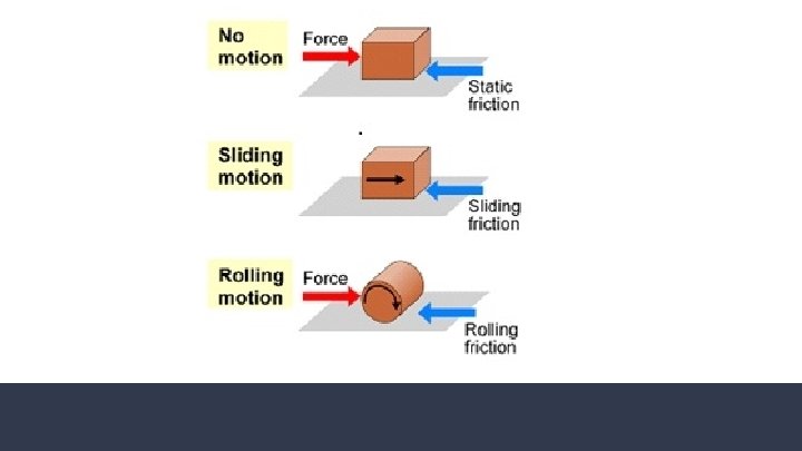 Friction - force that opposes the sliding motion of two touching surfaces 1. Static - two surfaces touching and keeping object at rest a. Example: what’s keeping your couch in place 2. Sliding - two surfaces slide past one another a. Sledding down a hill 3. Rolling - between rolling object and surface it rolls on a. Skateboard moving on ground