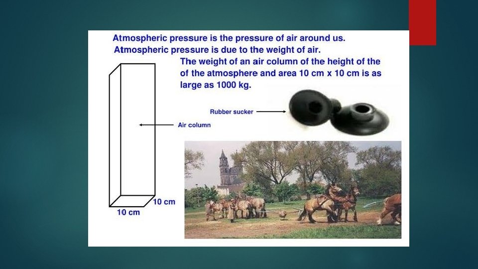 Pressure Force that is acting on unit area of a surface is called force. Pressure = Force/Area Unit of force is N/m 2. For a same magnitude of force, pressure increases with decrease in surface area and pressure decreases with increase in surfcace area. Eg : A force of 100 N is applying on a surface of area 10 m 2 and on a surface of area 25 m 2. In first case pressure is 10 N/m 2 In second case pressure is 4 N/m 2