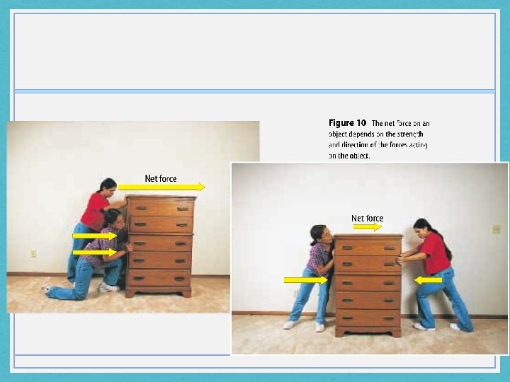 Combining Forces • When more than one force acts on an object, they combine. • The combination of all the forces acting on an object is called the net force • When the forces on an object are in the same direction, they are added together • When two forces on an object are in opposite directions, the net force equals the larger force minus the smaller force