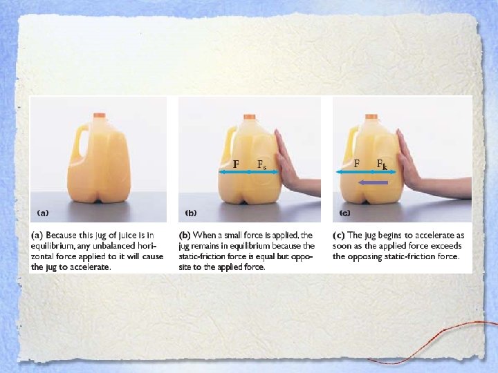 • When you push the jug with a small horizontal force, F, the table exerts an equal force in the opposite direction – The resistive force that keeps the jug from moving is the force of static friction, Fs • When the applied force is as great as it can be without causing the jug to move, the force of static friction reaches its maximum value, Fs, max