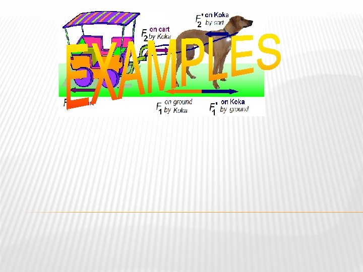 Only the forces that act on the same object cancel. Koka: when the ground pushes forward on the horse harder than the cart pulls backward Koka accelerates forward. (Fnet = F 1’ – F 2’ > 0) Cart : accelerates forward when horse force is greater the frictional force When we want to find acceleration of one body we have to find all forces acting on that body.