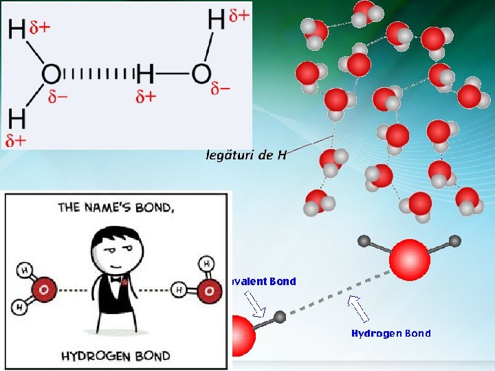 Legătura de hidrogen q cea mai puternică dintre forţele intermoleculare qse realizează între molecule care conţin H legat de un atom cu electronegativitate mare ( F, O, N) q între moleculele de : HF , H 2 O , NH 3