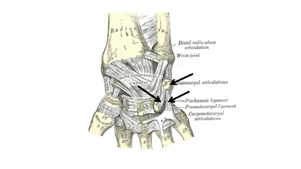 Flexor Carpi Ulnaris • Origin: -Humeral head From common flexor origin (front of medial epicondyle) -Ulnar head: medial border of olecranon -By aponeurosis from upper 2/3 of posterior border of ulna • Insertion: -Into pisiform bone - This insertion is prolonged by 2 ligaments: 1 - piso-hamate ligament to hook of hamate 2 Piso-metacarpal ligament to base of 5 th metacarpal bone