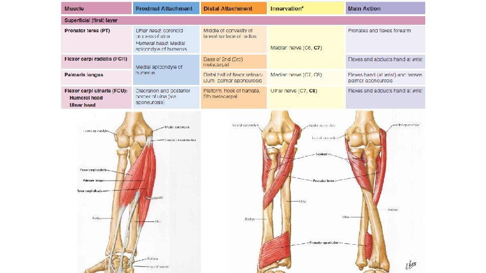 Superficial muscles of front of forearm Pronator teres Flexor carpi radialis Palmaris longus Flexor digitorum superficialis Flexor carpi ulnaris