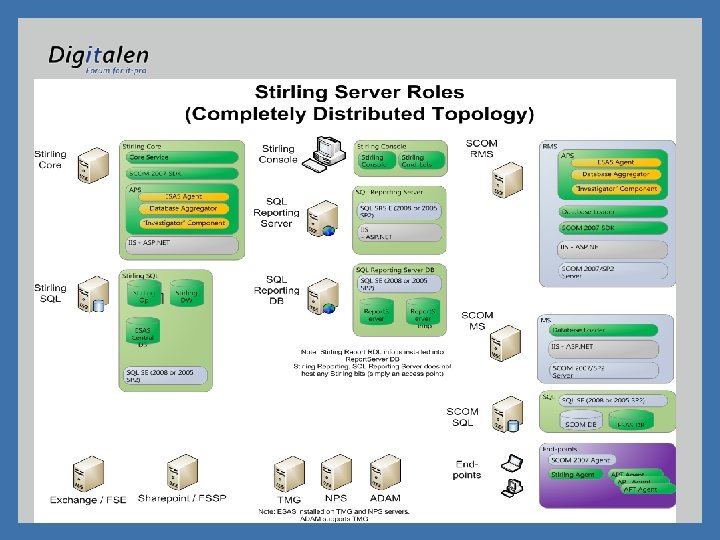 Stirling Server Roles • Stirling defines several roles that make up the overall system – Stirling Core – central processing – Stirling Core DB – Stirling databases – “DAC” • DAC-RMS – System Center Operations Manager – Root Management Server • DAC-MS – Management Server • DAC-DB – SCOM databases – Stirling Reporting – Stirling NPS (Network Policy Server) – Stirling Console