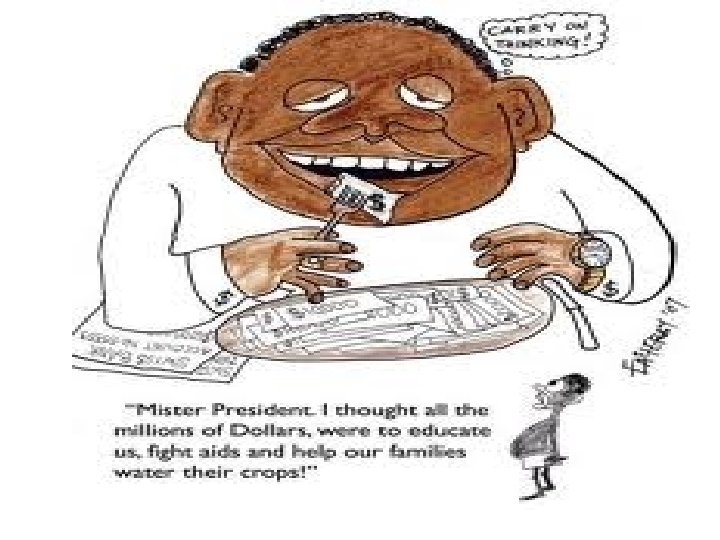 Sustaining corrupt leaders • No matter how irresponsible, corrupt, or oppressive a Third World government may be, • There is always some Western government or international agency anxious to supply it with a few more million dollars.