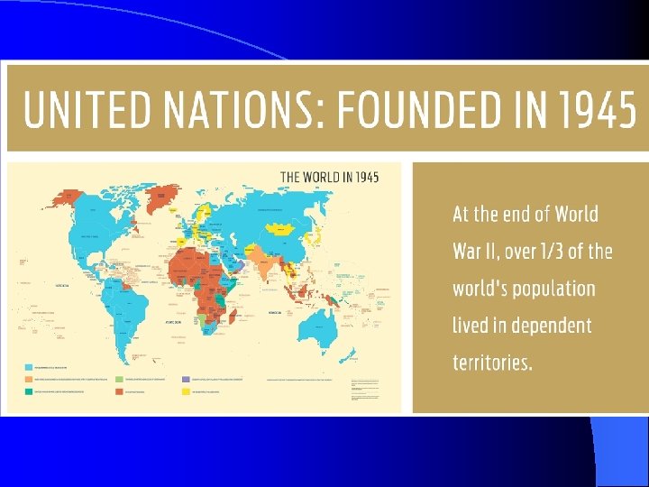 The United Nations l In 1945, representatives from 50 countries met to form the United Nations, an organization that promotes peaceful coexistence and worldwide cooperation. Now there are 193 member nations