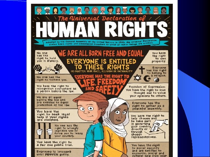 The United Nations The Universal Declaration of Human Rights was adopted by the United Nations, which details the rights to which all human beings are inherently entitled. l For example, you are innocent until proven guilty, no torture, the right to privacy, etc. l