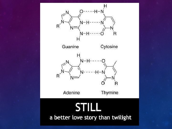 HYDROGEN BONDING • Hydrogen bonds between bases hold the two strands together • G-C has 3 • A-T has 2 • Hydrogen bonds can be broken easily • Two strands can separate to be copied