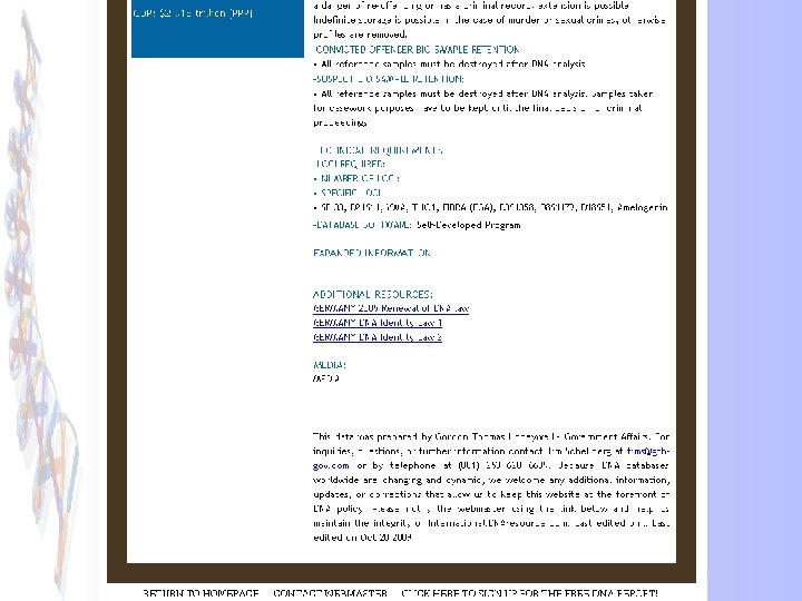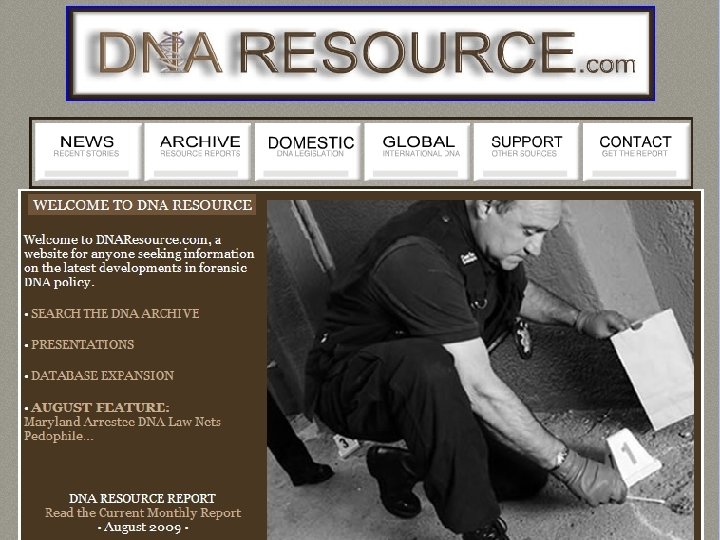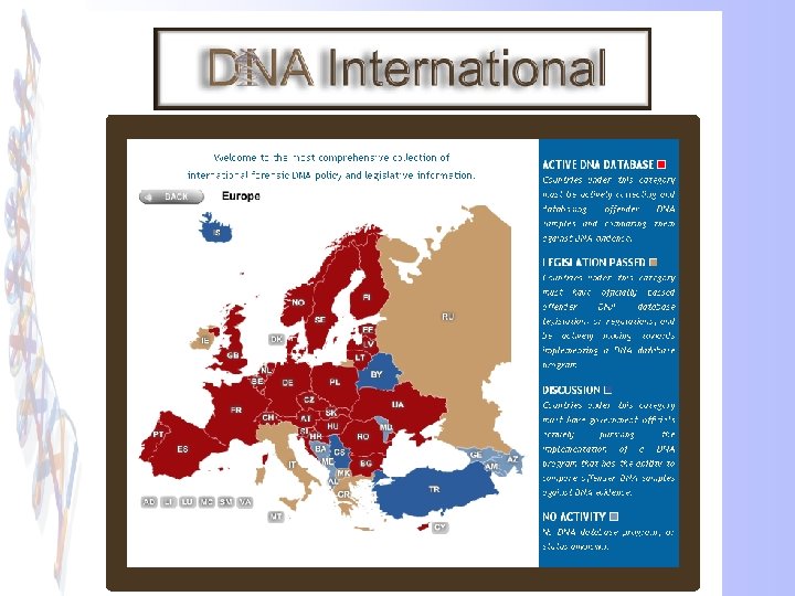 International. DNAresource. com • Comprehensive and upto-date information on DNA database programs worldwide. • Color-coded for easy recognition of database status • Country profiles include DNA database criteria and technical specifics • Continuously updated resources to include laws, amendments, news articles, and other external information