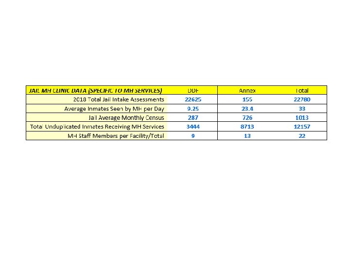 El Paso (EHN) Correctional Experience 1. Jail MH Clinic through EHN was opened/started providing services November 2014. 2. Services through the Jail MH Clinic include: A. B. C. D. E. F. G. H. I. Intake Assessments Psychiatric Evaluation and Follow Up Appointments Medication Management Individual and Group Therapy Crisis Intervention Case Management Skills Training/Life Skills Psycho-Social Education Discharge Assessment and Referrals Upon Release