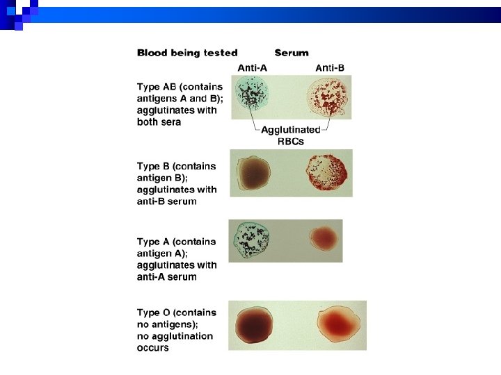 Blood Typing n Type A RBCs have A antigens, and the blood plasma has anti-B antibodies n Type B RBCs have B antigens, and the blood plasma has anti-A antibodies n Type AB RBCs have both A and B antigens, and the blood plasma has no antibodies n Type O RBCs have no antigens, but the blood plasma has both anti-A and anti-B antibodies