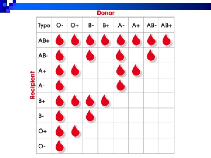 Blood Donation and Transfusion n Because of the immune response in blood, donation and transfusion is dependent on donor and recipient blood type. n Recipient blood should have NO antibodies that could react to the donor antigens, otherwise the blood would agglutinate in the recipient’s vessels, leading to rejection and death.