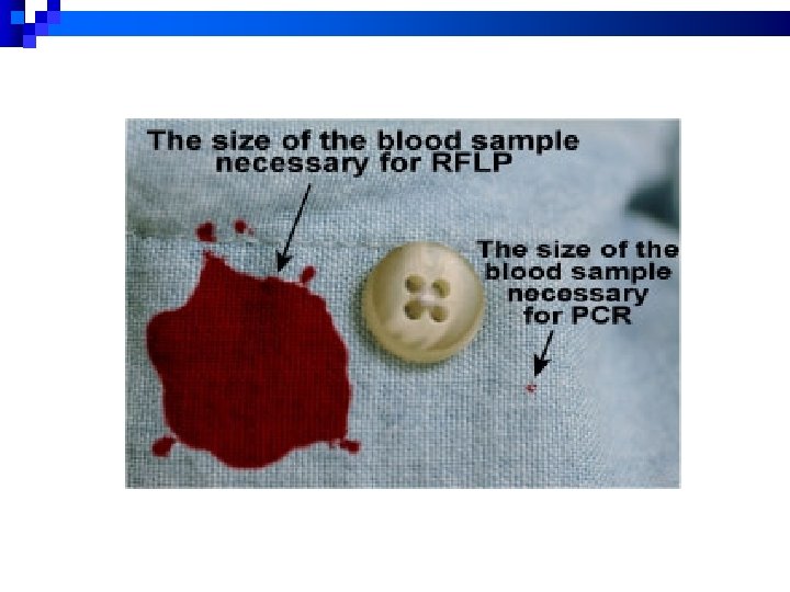 Sources of DNA at Crime Scenes n Examples of sources from real cases: ¨ Saliva on the stamp of a stalker’s threatening letter ¨ Skin cells shed on a ligature of a strangled victim ¨ Perspiration on a baseball cap discarded by a rapist was compared with the saliva swabbed from a bite mark on a different rape victim ¨ A single hair (without the root) found deep in a victim’s throat ¨ Maggot digestive contents