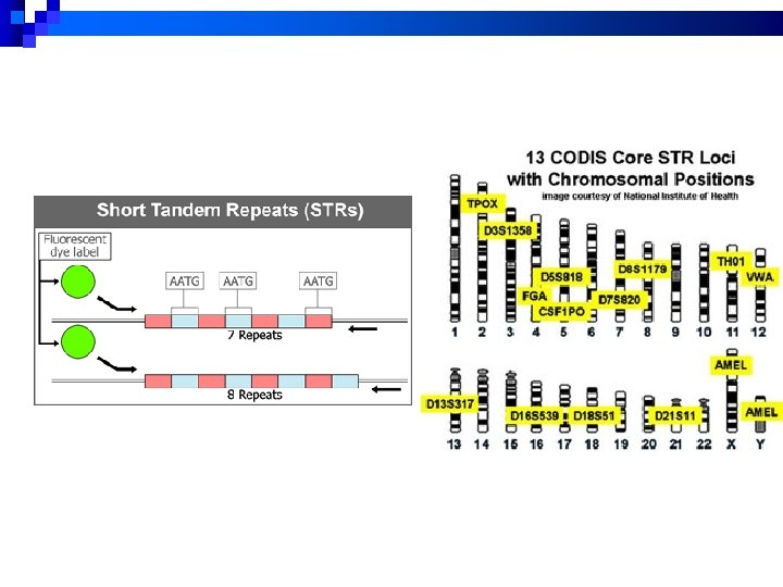 STR: Short Tandem Repeat Evaluates specific regions (loci) within nuclear DNA n FBI uses 13 standard specific STR regions for CODIS n The purpose of establishing a core set of STR loci is to ensure that all forensic laboratories can establish uniform DNA databases and, more importantly, share valuable forensic information. n