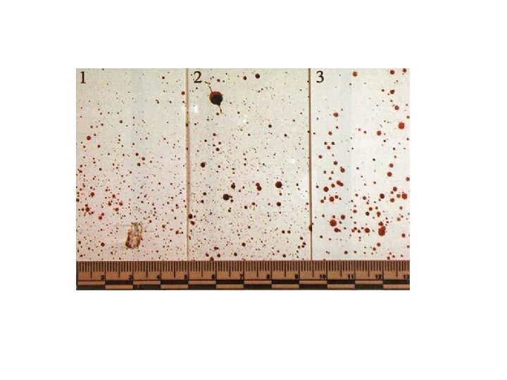 Blood Spatter • Blood spatterns can be used to explain events at a violent crime scene by examining the location, distribution and appearance of the spatters. • Observations and conclusions that can be used by investigators to determine the direction, dropping distance (height), and angle of impact can include: