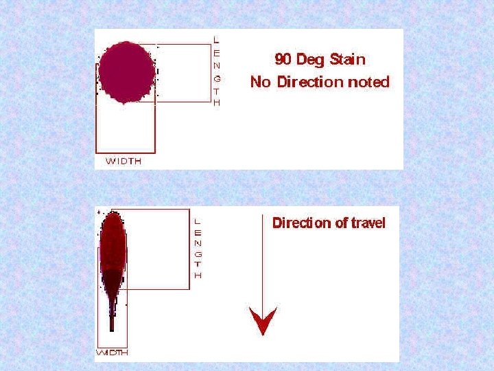 Directionality of Bloodstains • When a droplet of blood strikes a surface perpendicular (90 degrees) the resulting bloodstain will be circular. That being the length and width of the stain will be equal. • Blood that strikes a surface at an angle less than 90 degrees will be elongated or have a tear drop shape. • Directionality is usually obvious as the pointed end of the bloodstain ( tail ) will always point in the direction of travel.