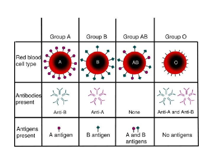 Blood Groups and Transfusions Antigens and Antibodies n Clumping of red blood cells following transfusion is called agglutination. n Agglutination is due to the interaction of proteins on the surfaces of red blood cells (antigens) with certain antibodies carried in the plasma.