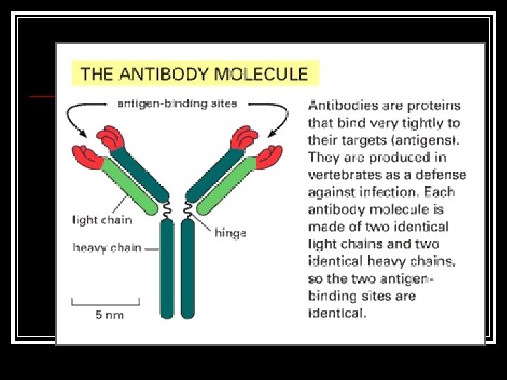 We can fool the immune system n n n The drug can be attached to a carrier molecule that is a protein This drug-protein combo can be injected into an animal such as a rabbit or rat (no human volunteers) The animal’s immune system will create antibodies that are specific to the shape of this drug-protein combo molecule We can isolate these antibodies from the animal’s blood serum And use these antibodies to detect the presence of the drug in human blood or urine