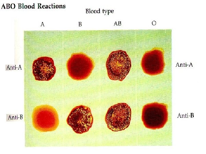 ABO Blood Group n Antigens are on red blood cells and antibodies are in the plasma. n Adverse transfusion reactions are avoided by preventing the mixing of blood that contains matching antigens and antibodies. – Adverse reactions are due to the agglutination of red blood cells.