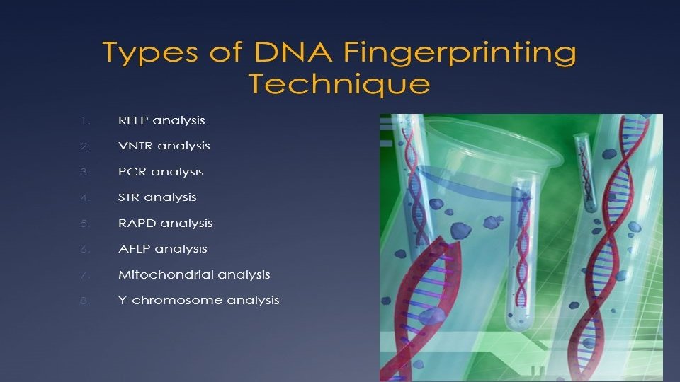 variable number tandem repeats (VNTRs) • VNTRs are broken into two subgroups, the minisatellites, which are the basis for much of the RFLP analysis. • Microsatellites, which are the basis of the current CODIS data-base. • The uniqueness of an individual’s VNTRs provides the scientific marker of identity known as a DNA fingerprint.