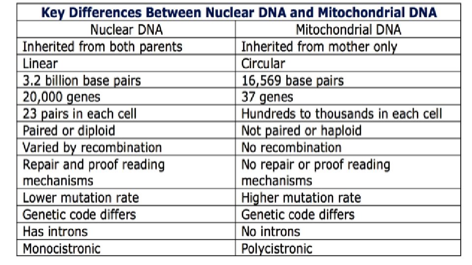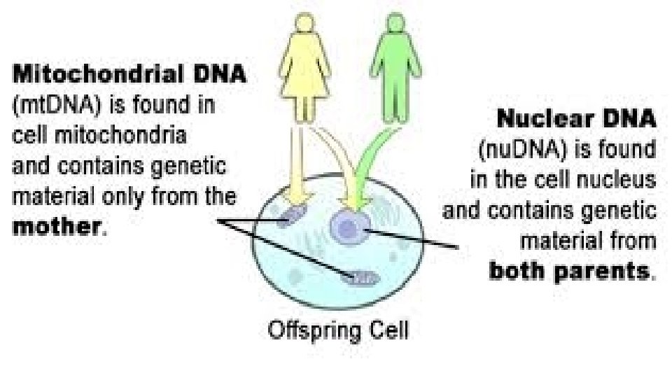 Mitochondrial DNA Analysis • analysis can be used to examine DNA from samples that cannot be analyzed by RFLP or STR. • DNA extracted from a mitochondrion. • The primary advantage of mt. DNA is that it is present in high copy number within cells and numerically more likely to be recovered from highly degraded specimens. • A major disadvantage is mt. DNA time-consuming to generate and review the 610 nucleotides of sequence information commonly targeted in hypervariable regions I and II (HVI and HVII) of the control region of the DNA. • All daughters have the same mt DNA as their mothers because the mitochondria of embryos come from the mother’s egg cell. The father’s sperm donates only nuclear DNA and no mitochondria.