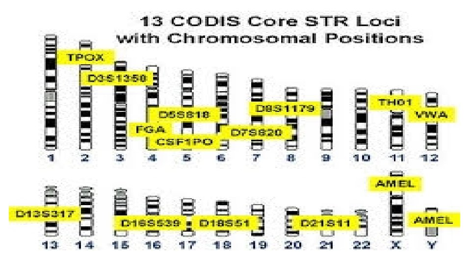 Short tandem repeat, or STR • DNA fingerprints produced by PCR are usually restricted to detecting the presence of microsatellites which are one-to six-nucleotide repeats dispersed throughout chromosomes. • Because these repeated regions can occur in many locations within the DNA, the probes used to identify them complement the DNA regions that surround the specific microsatellite being analyzed. • The FBI has chosen 13 unique STRs to test for DNA profiles contained within their Combined DNA Index System, or CODIS. • In early 2015, the FBI announced that an additional seven loci would be added to the CODIS Core effective January 1, 2017.