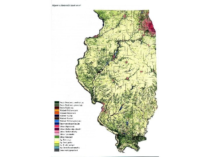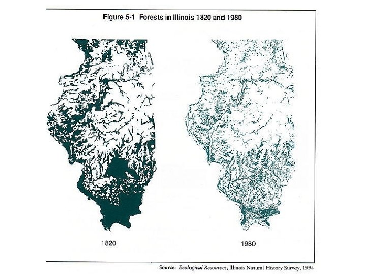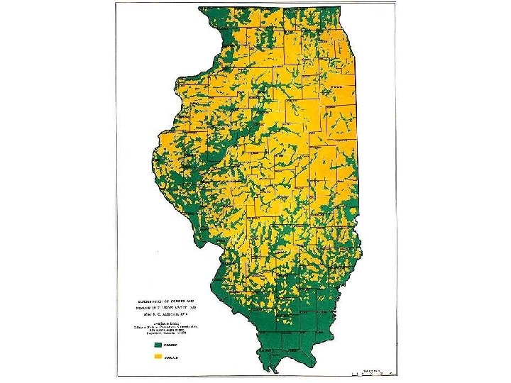 Change in Forest Acreage • In 1820, an estimated 38% of Illinois, some 13. 8 million acres, was forest. • Within a century only slightly more than 8% of this original forest remained and today only 11, 600 acres, or 0. 9%, of the presettlement forest is left. • Most forest in Illinois today (4. 27 million acres) is second or third growth