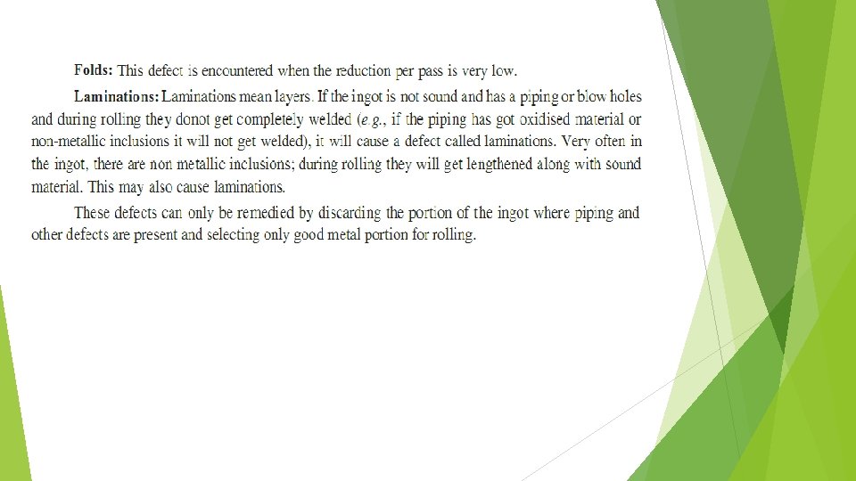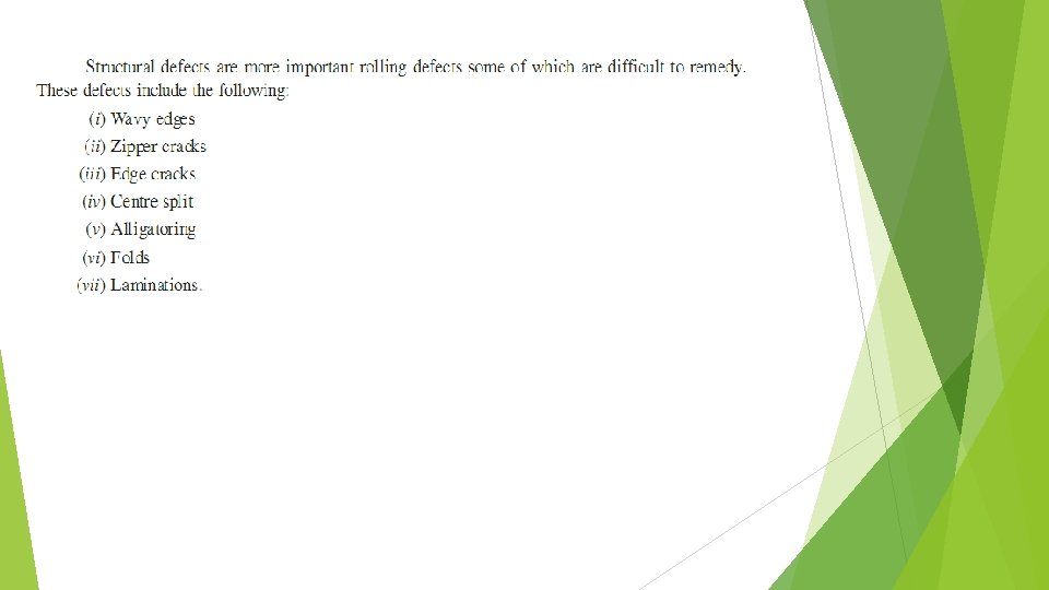 ROLLING DEFECTS To understand the causes and remedies of rolling defects, we shall divide them in two classes: 1. Surface defects, and 2. Structural defects. Surface defects include rusting and scaling, surface scratches, surface cracks, pits left on the surface of due to subsequent detachment or removal of scales which may have been pressed into the surface.