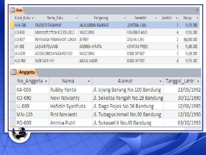 Pengertian & Fungsi • Form digunakan untuk mengontrol : – proses masukan data (input), – menampilkan data (output), – memeriksa dan memperbaharui data. • Form digunakan untuk merepresentasikan ke user atau menerima inputan dari user data-data dalam tabel/query dalam bentuk interface grid, tombol, dan lain-lain kontrol windows. form dalam access bisa dimasukkan ke dalam form lain sebagai control sub form, biasanya jika bekerja dalam transaksi master-detail