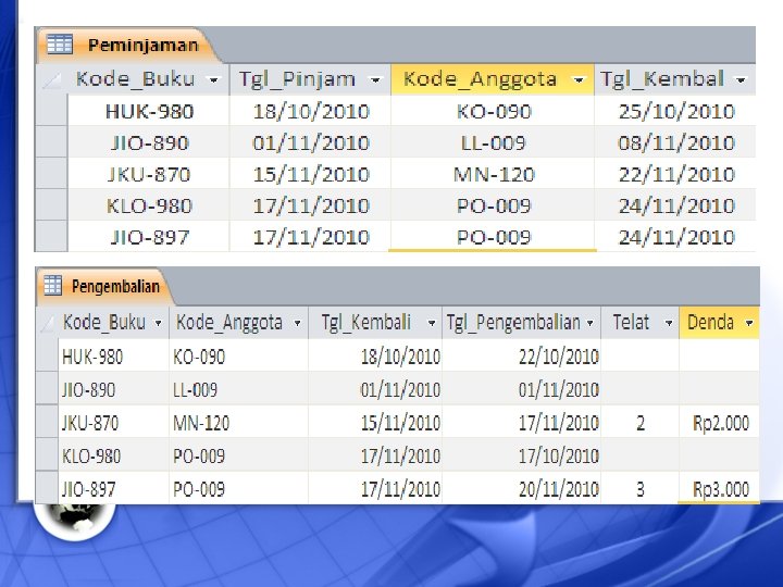 MEMBUAT FORM v Sebelum kita membuat Form, buatlah terlebih dahulu sebuah database yang bernama “Perpustakaan”. Perpustakaan v. Setelah itu buatlah 4 buah tabel dengan ketentuan sebagai berikut :