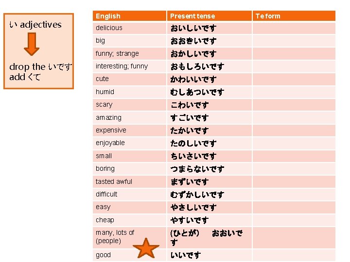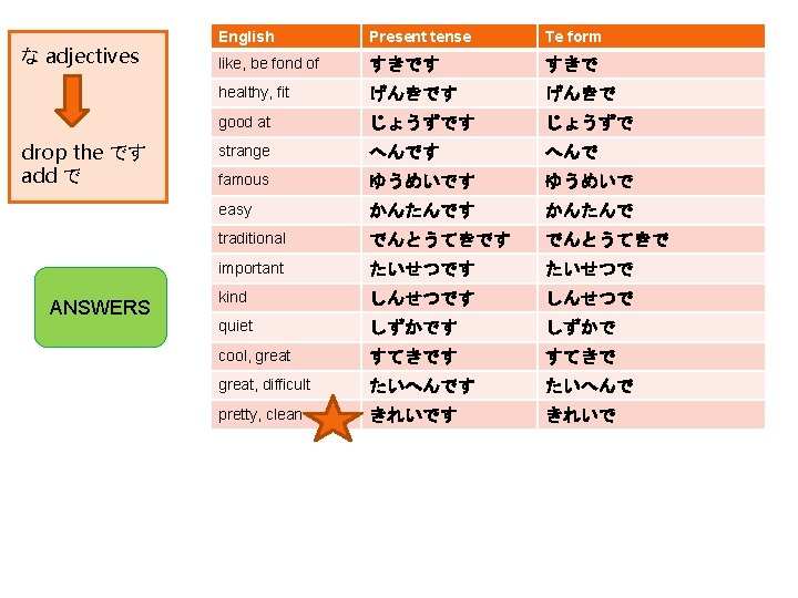 な adjectives drop the です add で English Present tense like, be fond of すきです healthy, fit げんきです good at じょうずです strange へんです famous ゆうめいです easy かんたんです traditional でんとうてきです important たいせつです kind しんせつです quiet しずかです cool, great すてきです great, difficult たいへんです pretty, clean きれいです Te form