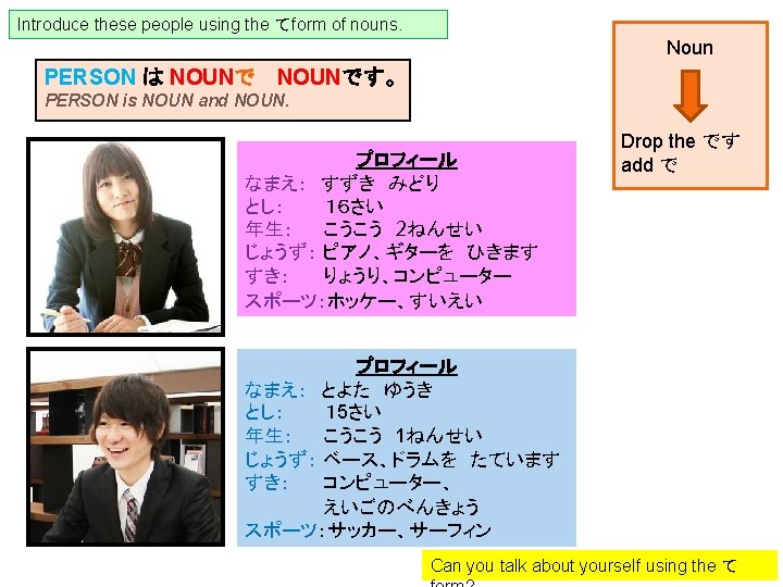 て Form Nouns = AND To join sentences which end in nouns we need to change the first noun into the ‘て form’ by dropping the です and adding で. Changing nouns into the てform: Noun drop the です add で Example: I am good at the guitar. I play the piano too. ギターが じょうずです。ピアノも ひきます。 I am good at the guitar and I play the piano too. ギターが じょうずで、ピアノも ひきます。