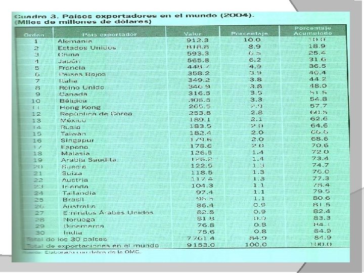 México se encuentra entre ellos ya que en el 2004 participo con el: 2. 1% de las exportaciones mundiales con un volumen total de 189. 1 miles de millones de dólares ocupando el 13 lugar. 2. 2% de las importaciones con un volumen total de 206. 4 miles de millones de dólares ocupando el 14 lugar.