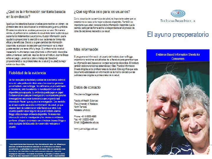 Joanna Briggs Institute – resumen § JBI es un organización científica con sede en la Facultad de Ciencias de la Salud, The University of Adelaide, South Australia. § A través de su base de datos y herramientas, JBI promueve y apoya la practica clínica basada en la evidencia para la atención a los pacientes. § La información disponible en JBI proviene de más de 70 centros en colaboración con JBI en todo el mundo. § JBI está disponible en exclusiva en la plataforma Ovid.