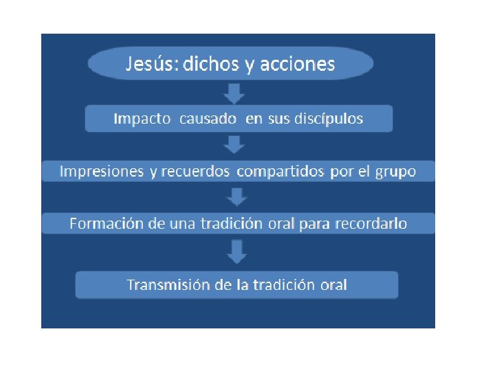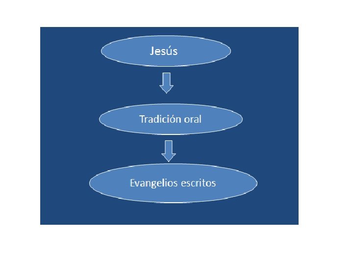 ETAPAS EN LA FORMACION DE LOS EVANGELIOS. • Como primera etapa está la experiencia directa de los discípulos que vivieron con Jesús y fueron sus testigos presenciales. Jesús los había enviado no a escribir, sino a predicar lo que habían visto y oído. • La segunda etapa comprende la fase de predicación que se llevó a cabo después de la muerte y la resurrección de Jesús hasta el año 65 aproximadamente, antes de la destrucción de Jerusalén (año 70). Esta fue la etapa de transmisión oral: a Jesús se lo proclamó como Cristo y Mesías, el Señor, el Salvador, el Hijo de Dios, iluminando su persona y su obra a la luz del Antiguo Testamento.