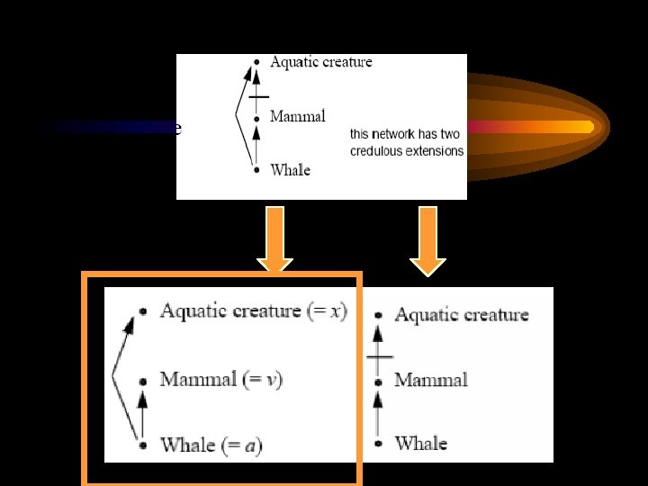 Extensões e extensões crédulas • • Extensão = conjunto de fatos tomados por verdade numa rede G é a-conectada sse para todo nó x (ou ¬x), há um caminho positv G é ambígüa sobre a se existem os caminhos a. . . x e a. . . ¬x Uma extensão crédula de G sobre a é a hierarquia não-ambígüa a-