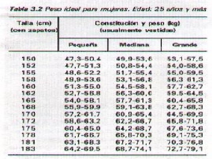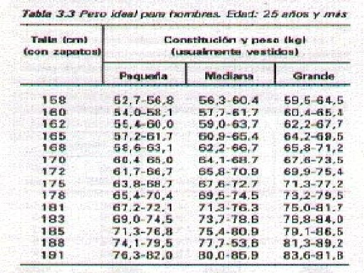 Las tablas de peso estandarizadas recomiendan los valores de peso ideal, de acuerdo a: l la talla, l la edad, l el sexo l la arquitectura o complexión corporal: pequeña l mediana l grande l