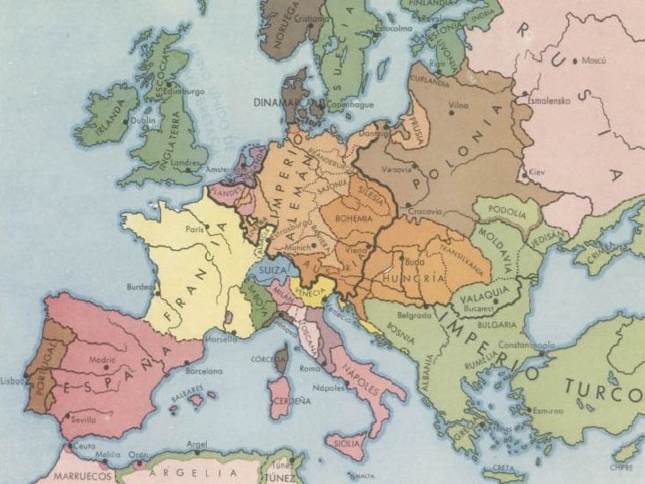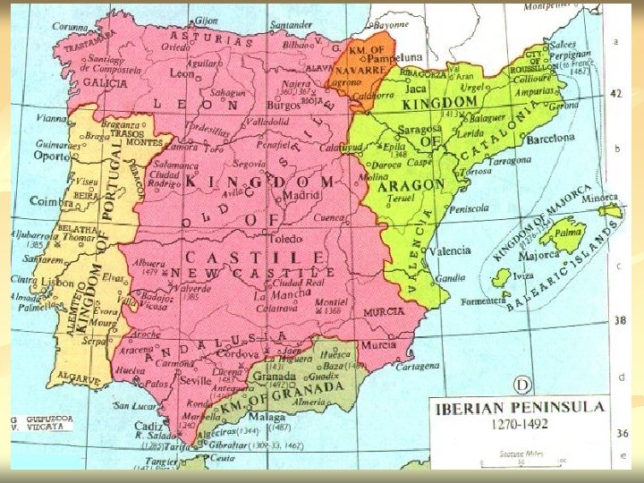 Formação do Estado Espanhol n n n n Guerra da Reconquista (séc. XI ao XV) Em 1469, a presença muçulmana estava restrita ao Reino Mouro de Granada Casamento de Isabel de Castela e Fernando de Aragão (1469) Morte de D. Henrique (1474) Criação de um exército permanente Conversão de judeus – Cristãos Novos- que representavam uma ameaça ao Estado em formação Reis Católicos- uniram-se a Igreja contra os mouros e os judeus apoiando a difusão da inquisição. A expulsão dos mouros do Reino de Granada ocorreu em 1492. O território é anexado e o Estado espanhol se consolida