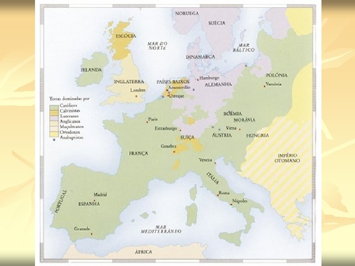 Calvinismo João Calvino, acabou rompendo com o Luteranismo para consolidar uma nova religião baseada na Teoria da Predestinação. Transformações: n Teoria da Predestinação: “Uns nascem para a Salvação, outros para a eterna danação” n Livre interpretação da bíblia n Culto em língua vulgar n Fim do celibato n O trabalho é um Dom divino dado aos homens. Portanto o trabalho deve ser valorizado. n • O Calvinismo se desenvolveu na Suiça, se espalhando por outros lugares. • Na França, os convertidos ao calvinismo eram conhecidos como Hugenotes • Na Inglaterra, os puritanos formavam um grupo de calvinistas com ideias distintas das originais • Na escócia os calvinistas era conhecidos como presbiterianos