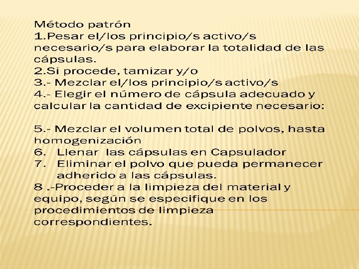 Fórmula patrón de elaboración de capsulas En general se ajusta a la siguiente forma: Principio activo 1. . . . x mg Principio activo 2. . . . x mg Excipientes, cuando proceda: Diluyentes. . . . . c. s. Lubricantes. . . . . c. s. Absorbente. . . . . c. s. Colorante. . . . . c. s. Cápsulas duras nº . . N