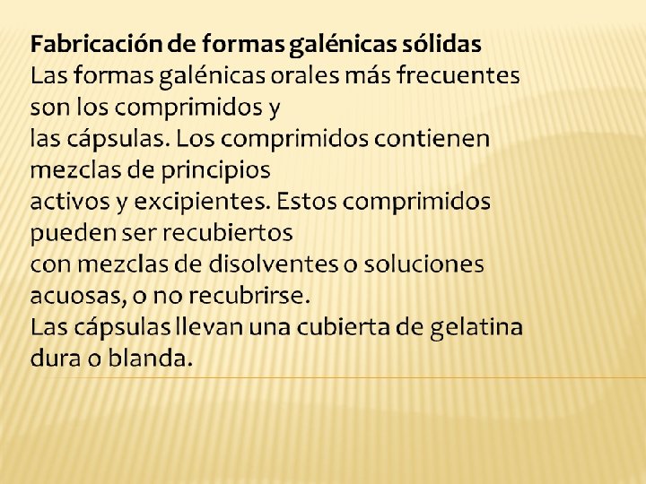 Tabletas – Comprimidos: Ø Formas farmacéuticas sólidas que contienen, en cada unidad, uno o varios principios activos. Ø Se obtienen aglomerando, por compresión, un volumen constante de partículas. Ø Se administran generalmente por deglución.