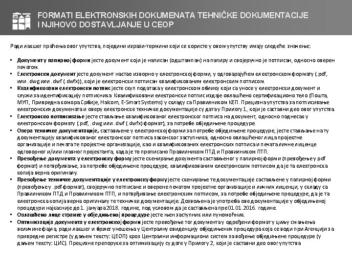 FORMATI ELEKTRONSKIH DOKUMENATA TEHNIČKE DOKUMENTACIJE I NJIHOVO DOSTAVLJANJE U CEOP gradjevinskedozvole. rs E-procedura Tehnička uputstva Uputstvo – formati elektronskih dokumenata i njihovo dostavljanje u CEOP-u