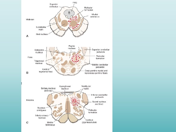 FORMATIO RETICULARIS – 3 fő magoszlop Medián magoszlop: Raphe magok – serotonin Medialis magoszlop: nagy sejtek (magnocelluláris zóna) Lateralis magoszlop: kis sejtek (parvocellularis zóna)