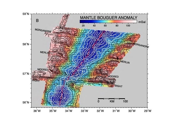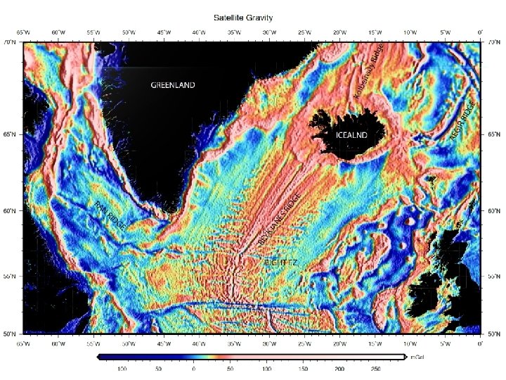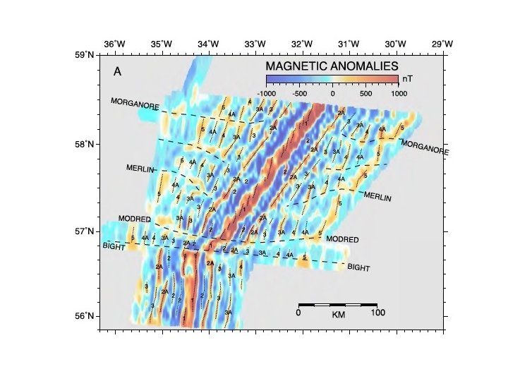 3 MODES OF SEAFLOOR SPREADING FLANKING THE REYKJANES RIDGE MAGNETICS SATELLITE-DERIVED GRAVITY 1) UNSEGMENTED ORTHOGONAL SPREADING ON A LONG LINEAR RIDGE (THICK CRUST) 2) ORTHOGONAL SPREADING ON A SEGMENTED RIDGE (THINNER CRUST) 3) OBLIQUE SPREADING ON AN UNSEGMENTED LINEAR RIDGE (THICK CRUST)