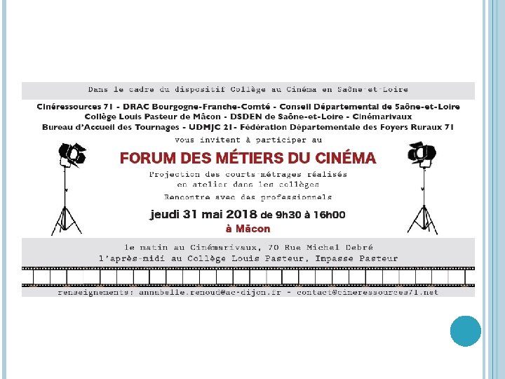ATELIERS VIDÉOS ET FORUM DES MÉTIERS DU CINÉMA Dans la continuité du Parcours d’Education Artistique et Culturelle (rencontre/connaissance/pratique), des ateliers vidéos sont proposés aux enseignants désireux de poursuivre l’aventure Collège au Cinéma. Ces ateliers sont encadrés par des professionnels et peuvent en partie être financés via le dispositif d’appel à projet en faveur des collégiens au Conseil Départemental de Saône-et-Loire. Les ateliers ne nécessitent pas de compétence en matière de réalisation vidéo de la part des enseignants. Trois volets : Projections de trois films grâce au dispositif Collège au Cinéma, en partenariat avec le CNC, la DRAC et le Conseil Départemental. Ateliers vidéo avec réalisation de courts-métrages sur le thème de l’année, en partenariat avec des associations locales. Forum des métiers du cinéma et projection des courts-métrages dans une salle de cinéma.