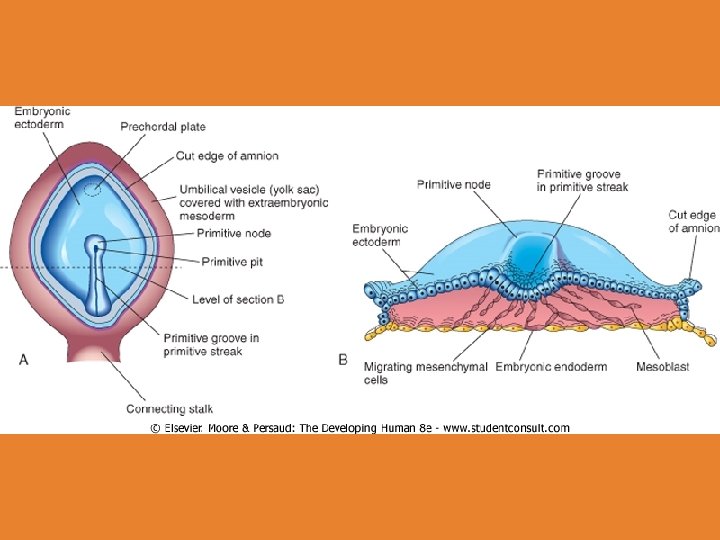 • The first morphologic sign of gastrulation begins with formation of the primitive streak on the surface of the epiblast of the embryonic disc