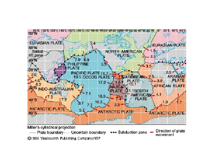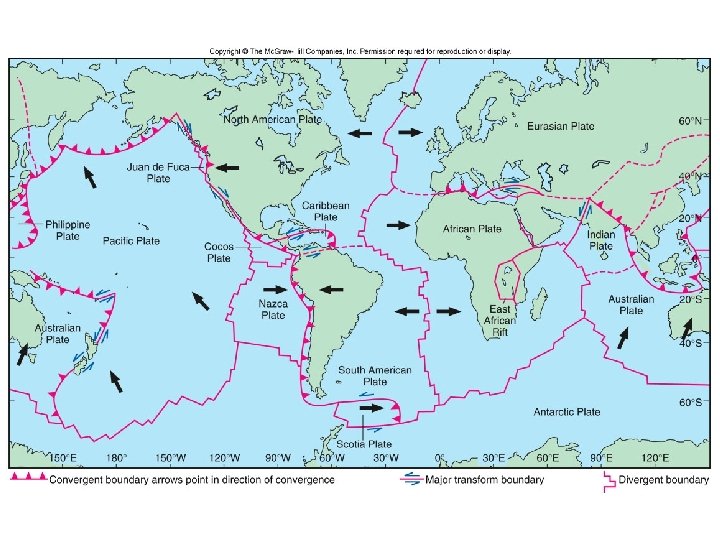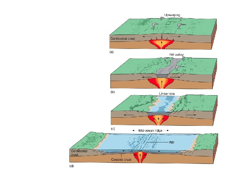 Divergent Margins • Oceanic Divergent Margins – – Two spreading plates, upwelling magma Central Rift Valley and Oceanic Ridge Mid Atlantic Ridge (Slow 1 -5 cm/year) East Pacific Rise (Fast 9 -18 cm/year) • Continental Divergent Margins – Crustal upwarp, Rift Valley, Linear Ocean – East African Ridge, Red Sea