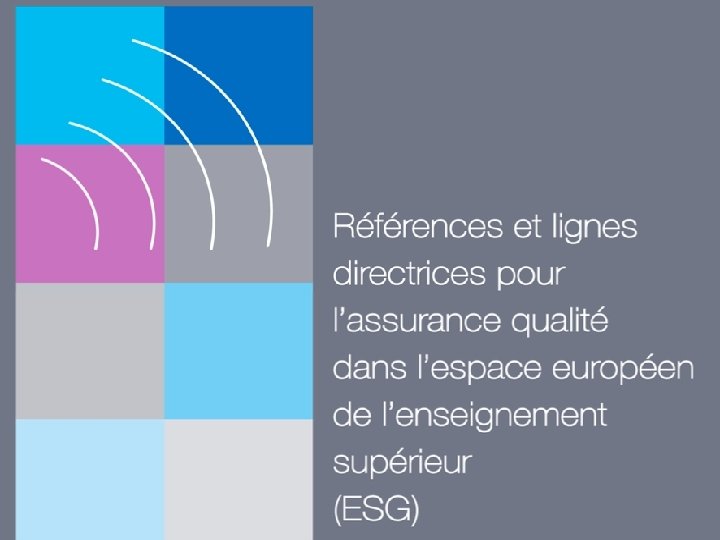 Les références européennes La partie 1 - Les responsabilités de l’institution d’enseignement supérieur • Références et lignes directrices pour l’assurance qualité interne La partie 2 - Les responsabilités de l’agence d’assurance qualité • Références et lignes directrices pour l’assurance qualité externe La partie 3 – Les responsabilités des concepteurs et des évaluateurs des agences • Références et lignes directrices pour les agences d’assurance qualité